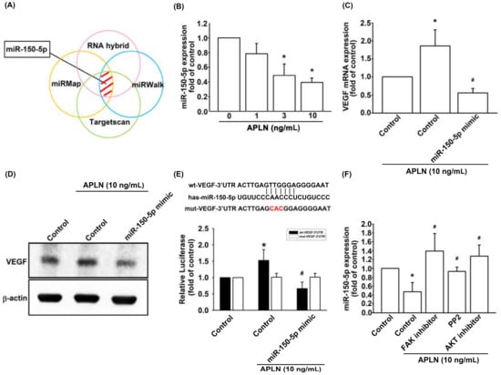 Apelin suppression of miR-150-5p enhances VEGF production. (A) Open-source software (TargetScan, miRMap, RNAhybrid, and miRWalk) was employed to determine which miRNAs could potentially inhibit VEGF transcription. (B) OASFs were incubated with APLN. miR-150-5p expression levels were examined using RT-qPCR assay (n = 4). (C,D) OASFs were transfected with miR-150-5p mimic and then stimulated by APLN. (C) VEGF transcription and (D) translation levels were examined using RT-qPCR (n = 4) and ELISA assays (n = 5). (E) OASFs were transfected with the mt-VEGF-3′UTR plasmid with or without miRNA-150-5p mimic, then incubated under APLN. Relative luciferase activity reflected VEGF promoter activity (n = 6). (F) OASFs were treated with FAK, Src, or Akt inhibitor then incubated with APLN. miR-150-5p expression levels were examined using RT-qPCR assay (n = 4). * p < 0.05 compared with control; # p < 0.05 compared with the APLN-treated group.