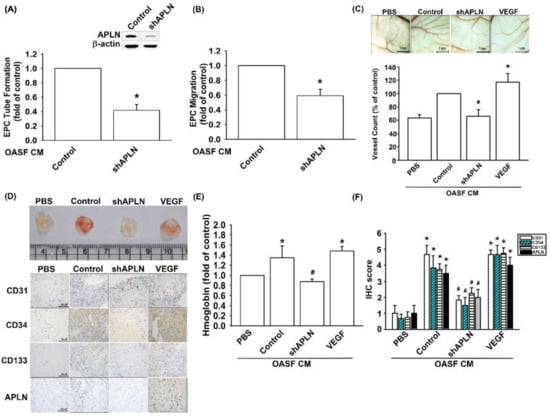 To confirm APLN-mediated VEGF-dependent angiogenesis in vivo, shAPLN was infected into OASFs 1 and 7 days before incubation with APLN. CM after APLN incubation was collected for analysis. shAPLN abolished CM-enhanced EPC tube formation and migration (Figure 6A,B). The collected CM was later employed for the CAM and Matrigel plug assays, while VEGF (50 ng/mL) served as the positive control. CM collected after APLN incubation demonstrated similar angiogenesis capacity to that of the VEGF positive control. However, APLN knockdown by shAPLN transfection lowered the vessel count under CAM assay (Figure 6C) and mitigated microvessel formation in Matrigel plugs, as confirmed by hemoglobin levels and CD31, CD34, CD133, and APLN IHC staining (Figure 6D–F, and Supplementary Figure S2).