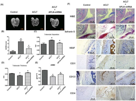 shAPLN ameliorates histologic severity of OA. (A) Micro-CT images of the control knee, anterior cruciate transection (ACLT) knee, and shAPLN-transfected ACLT knee (n = 8). (B–E) OARSI scores (B), micro-CT parameters, including trabecular separation (C), trabecular thickness (D), and volumetric bone mineral density (E), of the control knee, ACLT knee, and shAPLN-transfected ACLT knee. (F) Specimens from the control knee, ACLT knee, and shAPLN-transfected ACLT knee were immunostained with Safranin-O, VEGF, CD31, CD133, and CD34. * p < 0.05 compared with control; # p < 0.05 compared with the APLN-treated group.