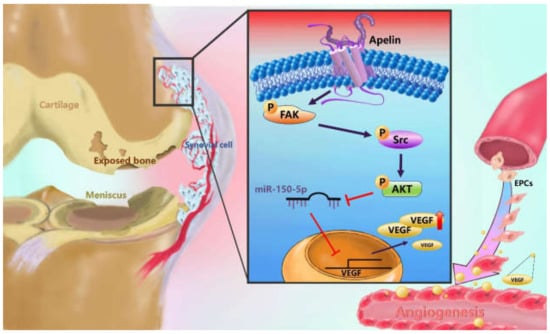 Schematic diagram summarizes the mechanism whereby Apelin upregulates VEGF expression in human synovial fibroblasts. APLN induces VEGF expression and angiogenesis through the FAK/Src/Akt signaling cascade and reduces miR-150-5p expression in OASFs. FAK: focal adhesion kinase; VEGF: vascular endothelial growth factor; EPCs: Human endothelial progenitor cells.