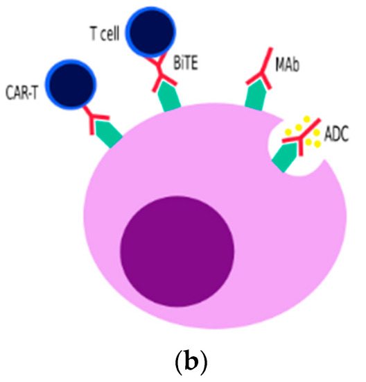 Antibody–drug conjugate (ADC) is a recombinant MAb conjugated to a small-molecule cytotoxin. ADC targets antigens on myeloma cells and delivers the cytotoxic agent directly to the myeloma cells following internalisation of the compounds after binding to the target antigen [108]. It has received great attention recently due to its ‘off-the-shelf’ availability, as compared with chimeric antigen receptor (CAR) T-cell therapy.