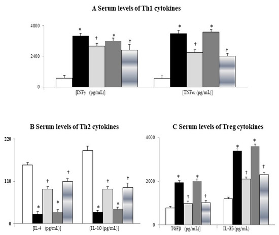 Serum T-helper 1 (Th1)/Treg cytokines were increased and serum Th2 cytokines were decreased in cirrhotic mice. Serum levels of Th1 (A), Th2 (B), and Treg (C) cytokines. * p < 0.05 vs. sham-V group; † p < 0.05 vs. BDL-V/TAA-V group.