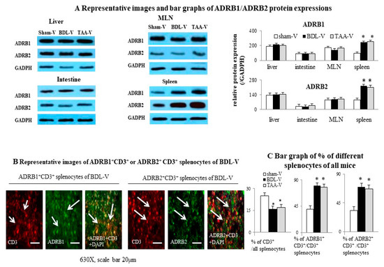 Over-expressions of β1 and β2 adrenergic receptors (ADRB1 and ADRB2) proteins were noted in spleen and splenic T lymphocytes of cirrhotic mice. (A) Representative images and bar graphs of ADRB1/ADRB2 protein expressions in liver, intestines, mesenteric lymph node (MLN), and spleen in sham-V and cirrhotic (BDL-V/TAA-V) mice; (B) Representative immunofluorescence images of ADRB1+ CD3+ or ADRB2+ CD3+ splenocytes of BDL-V mice. White arrows represent positive of CD3, ADRB1, ADRB2, CD3 and ADRB1 or CD3 and ADRB2; (C) Bar graphs of percentages of CD3+, ADRB1+ CD3+ and ADRB2+ CD3+ splenocytes of sham-V or cirrhotic (BDL-V/TAA-V) mice. * p < 0.05 vs. sham-V group.