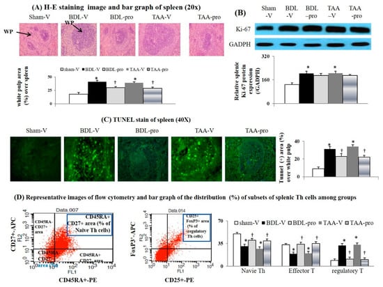 Chronic propranolol treatment suppressed the splenic white pulp (WP) hyperplasia, inhibited abnormal proliferative/apoptotic activities of spleen and modified distribution of the Th cell subsets in cirrhotic mice. (A) Representative images and bar graphs of H-E stain of splenic WP area; (B) Splenic Ki-67 protein expression; (C) Representative immunofluorescence images and bar graphs for the splenic TUNEL (+) area; (D) The distribution of splenic naïve T (% of CD45RA+ CD27+) cell, effector memory T (% of CD45RA− CD27+ plus CD45RA+ CD27− plus CD45RA− CD27) cells and regulatory T (% of CD25+ FoxP3+) cells among CD4+ Th cells. * p < 0.05 vs. sham-V group; † p < 0.05 vs. BDL-V/TAA-V group.