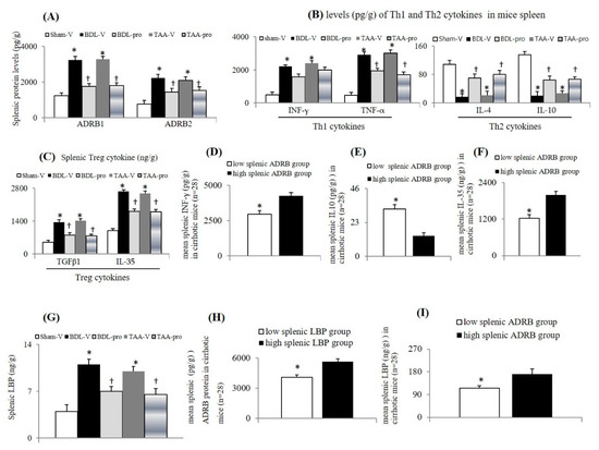High tissue levels of ADRB1/ADRB2 proteins were associated with high levels of Th1/Treg cytokines and LBP in the spleens of cirrhotic mice. (A–C) levels of ADRB1/ADRB2 proteins and of Th1/Th2/Treg cytokines; (D–F) Mean levels of INF-γ, IL-10 and IL-35 in cirrhotic mice of “high” ADRB and “low” ADRB groups. (G) Splenic LBP level between groups; (H) LBP levels in cirrhotic mice of “high” ADRB group and “low” ADRB group. (I) ADRB protein Levels between “high LBP” and “low LBP” groups. In cirrhotic mice, “high” ADRB or LBP groups were defined by high percentages (> third percentile, cut-off point is 393 for ADRB protein levels, and 1057 for splenic LBP levels) of summative increased splenic ADRB1 and ADRB2 protein or LBP levels compared to sham-V mice. * p < 0.05 vs. sham-V/high ADRB or LBP groups; † p < 0.05 vs. BDL-V/TAA-V group; LBP: lipopolysaccharide binding protein.