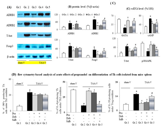 Acute propranolol incubation inhibited Treg-conditioned differentiation and restored Th2-conditioned differentiation of Th cells isolated from the spleens of cirrhotic mice. (A,B) Representative images and bar graphs of proteins and mRNAs (%/18S); (C) Expressions in cell lysates of Th cells isolated from spleen of sham-V or TAA-V mice; (D) Flow cytometry-based intracellular cytokine staining for percentages of Th1/Th2/Treg-conditioned differentiation among groups. * p < 0.05 vs. sham-V group; † p < 0.05 vs. TAA-V group.