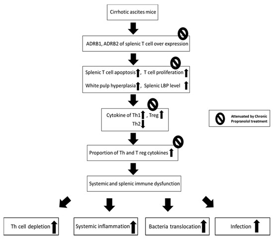 A β-adrenergic agonist, isoproterenol, inhibits the proliferation and differentiation of T cells [17]. In particular, T cell differentiation and activation are regulated by the β2-adrenergic receptors (ADRB2) expression on their surface [18,19]. Stimulation of the ADRB2 on naïve T cell populations favors Th1 differentiation, and this effect is blocked by β-antagonists. Overall, activation of ADRB2s inhibits cellular immunity. Therefore, in cirrhotic mice, activated hepatic β1-adrenergic receptor (ADRB1) facilitates BT, which can be counteracted by administering a pre-treatment with β1 blockers [11]. Propranolol treatment can suppress over-activated splenocytes, reduce inflammatory cytokines release, and improve splenomegaly in mice with social disruption stress [20].