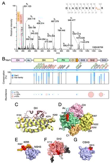 All the identified acetylation sites are surfaced-exposed in the Vav1 3D structure (Figure 2C–G). They also cluster within relevant domains of the protein such as the DH Rac1 binding site (Figure 2B,C), the DH surface opposite to the catalytic site (Figure 2B–D), the PH (Figure 2B,D), the KRR (Figure 2B,E), the SH2 (Figure 2B,F), and the CSH3 (Figure 2B,G). However, they display in general low levels of phylogenetic conservation among the Vav1 analogs and paralogs identified to date in both invertebrate and vertebrate species (Figure 2B and Figure S1) [].