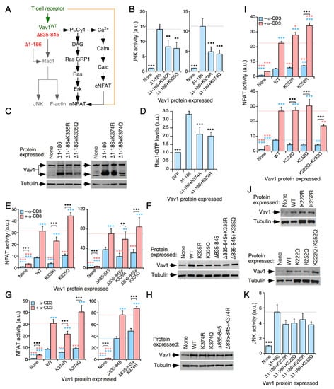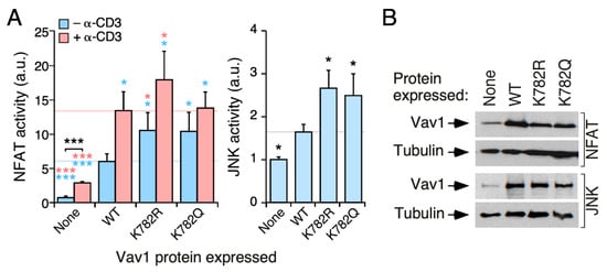 The stimulation of the NFAT pathway by Vav1 is mediated by a GTPase-independent, adaptor-like mechanism that involves the phospholipase Cγ-mediated stimulation of the nuclear translocation and activation of this transcriptional factor (Figure 3A). The optimal activation of this pathway requires synergistic inputs from TCR-triggered signals (Figure 3A). Due to this, the stimulation of NFAT is boosted by the engagement of the TCR even when using constitutively active versions of Vav1. Due to this, this assay is conventionally used to monitor the activation levels of this adaptor function of Vav1 [,,]. In this assay, the mutations in the acetylation sites were generated both in the case of the full-length protein and one of its C-terminally truncated versions (Vav1Δ835−845). The latter protein displays, similarly to Vav1Δ1−186, constitutive, tyrosine phosphorylation-independent biological activity due to the lack of the autoinhibitory CSH3 domain []. However, unlike the case of Vav1Δ1−186 [,,], Vav1Δ835−845 is capable of activating the NFAT pathway since it still keeps the N-terminal CH domain []. The use of this mutant allowed us to discriminate whether the alterations generated by the acetylation site mutations on Vav1 signaling were related to either the early phosphorylation-dependent Vav1 activation step (in that case, the mutants should affect the biological activity of Vav1WT but not of Vav1Δ835−845) or to subsequent effects in the effector signaling phases of the activated protein (in this case, the mutations on the acetylation sites must also affect the signaling output of Vav1Δ835−845).