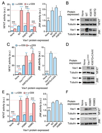 We next analyzed the potential contribution of the acetylation of the Lys587 and Lys588 residues to the biological activity of Vav1. These two residues are potentially interesting, since they are located in the Vav1 KRR that mediates interactions with phosphatidylinositol monophosphates [] (Figure 2B,E). We found that the K587Q mutation (that mimics the constitutively acetylated state of this residue), but not the K587R missense change (that mimics the deacetylated state of this site), promotes a marked downregulation of the NFAT activity of the full-length Vav1 protein when tested both in nonstimulated and TCR-stimulated Jurkat cells (Figure 4A, left panel; Figure 4B, two top panels). It also induces a slighter inhibition of full-length Vav1-triggered JNK activity (Figure 4A, right panel, Figure 4B, two bottom panels). The negative effect of the K587Q mutation is eliminated when tested in the context of the Vav1CAAX protein (Figure 4C,D), thus indicating that the defect is related with the stable association of the mutant protein with the plasma membrane. The same behavior was observed before in the case of mutants targeting other residues of the Vav1 KRR []. The activity of Vav1K588R and Vav1K588Q proteins show no statistically significant alteration when tested in both NFAT and JNK assays (Figure 4E,F). This result indicates that the Lys587 residue is a functionally relevant Vav1 acetylation site.