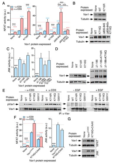 Given the importance of the SH2 domain for the tyrosine phosphorylation of Vav1 [,], we next investigated the possible impact of the Lys716 mutations on Vav1 tyrosine phosphorylation levels. We found that the K716Q mutation, but not the K716R one, promotes a marked reduction in the tyrosine phosphorylation levels of full-length Vav1 in both nonstimulated Jurkat (Figure 5E, left panel) and serum-starved COS1 (Figure 5E, right panel) cells. This effect is similar to that found when using a Vav1 mutant protein bearing a point mutation (G691V) that inactivates the phosphotyrosine-binding activity of its SH2 domain (Figure 5E). However, unlike the case of the G691V missense change, the full-length Vav1 protein bearing the K716Q mutation exhibits levels of tyrosine phosphorylation comparable to those found in Vav1WT when monitored in both TCR-stimulated Jurkat (Figure 5E, left panel) and EGF-stimulated COS1 (Figure 5E, right panel) cells. These results suggest that this mutation reduces, but does not abrogate, the affinity of the Vav1 SH2 domain for its tyrosine phosphorylated ligands. However, it is unlikely that this is the underlying cause of the deleterious effects of the K716Q mutation on Vav1 activity for the following reasons. (i) The K716Q mutation does not impair the stimulation of JNK by the full-length Vav1 protein (Figure 5C,D), which is an activity that is also tyrosine phosphorylation-dependent [,]. (ii) This mutation also impairs the stimulation of NFAT by the phosphorylation-independent Vav1Δ835−845 protein (Figure 5A,B). (iii) The reduced activity of the Vav1K716Q mutant in NFAT assays cannot be restored by the attachment to the protein of the membrane-anchoring signal of H-Ras (Figure 5F,G). This signal promotes high levels of Vav1 activity due to enhanced membrane localization and phosphorylation [].