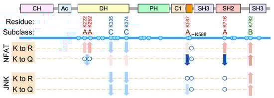 We considered that a lysine acetylation site was functionally relevant when it fulfilled two criteria: (i) that the Lys to Arg or the Lys to Gln mutant versions of Vav1 on those sites elicited changes in either the NFAT or JNK activity when compared to the WT counterpart; (ii) that those effects were opposite in the case of the Lys to Arg and Lys to Gln mutants (e.g., effect/no effect, activation/inactivation, or vice versa); and (iii) although prima facie counterintuitive, we also deemed as potentially relevant sites those in which the Lys to Arg and Lys to Gln mutations elicited the same effect on the biological activity of the mutant protein. The inclusion of these sites was based on the fact that those two types of mutations can elicit the same effect if they target lysyl groups that perform a key intramolecular role in the protein that cannot be replaced by the side group of the newly incorporated mutant residue. This scenario was contemplated given our previous experience with the characterization of the key regulatory tyrosine phosphorylation sites of Vav proteins. Indeed, during these analyses, we found that the dephosphorylation- (Tyr to Phe) and phosphorylation-mimicking (Tyr to Glu) mutations elicited in fact the same activation effect on the mutant proteins [,,,] (see our further explanation of this in the Discussion section).