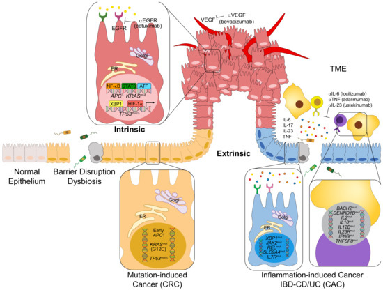 Although 96% of all CRCs do not develop in the context of pre-existing inflammation, the roles of chronic inflammation, tumor-elicited inflammation, the tumor microenvironment (TME), and partially adaptive immune cells in CRC development, have been established, particularly in the context of their interaction with gut dysbiosis [18,19,20,21,22,23]. Colitis-associated cancer (CAC) is a specific subset of CRC characterized by its implication with inflammation that accounts for 1%–2% of all CRCs [24]. CAC, originating from either the chronic inflammation in both the colon and the small intestine, or solely the colon, as is the case of Crohn’s disease (CD) or ulcerative colitis (UC), respectively, is classified by the excessive activation and recruitment of immune cells that produce inflammatory cytokines, such as TNF, IL-17, IL-23 and IL-6, that lead to the propagation of an inflammatory and possibly premalignant environment [25]. Mutations involved in inflammatory bowel disease (IBD) development include genes that regulate immune activation and the subsequent response, such as IL12B, IL2, IFNG, IL10, TNFSF8, TNFSF15, IL7R, DENND1B, JAK2 and those that also regulate ER stress, glucose, bile salt transfer and organic ion transporter, including XBP1, SLC9A4, SLC22A5 and SCL11A1, as shown in Figure 1 [26]. Both CRC and CAC exhibit inflammatory microenvironments, but the order in which inflammation and tumorigenesis occur seems to be different. In CRC, inflammation follows tumorigenesis. Mutations due to environmental factors initiate tumor development in CRCs, and the subsequent activation of inflammatory cells can induce further DNA damage through the production of reactive oxygen species (ROS) and reactive nitrogen intermediates (RNIs) [25,27]. On the other hand, inflammation precedes tumorigenesis in CAC. Inflammation induced by the activation of immune cells and their release of proinflammatory cytokines can induce DNA damage and mutations in CAC [25]. Correspondingly, both CRC and CAC may entail similar mutations, but the timing and order of these mutations are different, as displayed by early APC and late TP53 mutations in CRC, and early TP53 and late APC mutations in CAC [28,29,30]. Another important contributor to CRC emergence is so-called tumor-elicited inflammation driven by the loss of normal barrier function as a result of APC inactivation [18].