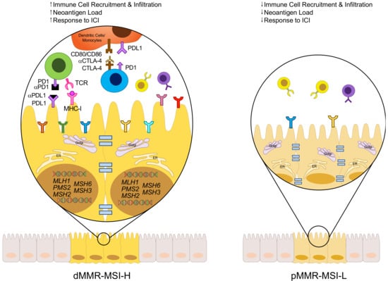 Since T cell infiltration is representative of a better clinical outcome in CRC patients, it is clear why dMMR-MSI-H tumors respond well to ICI, and pMMR-MSI-L tumors do not [76,77].
