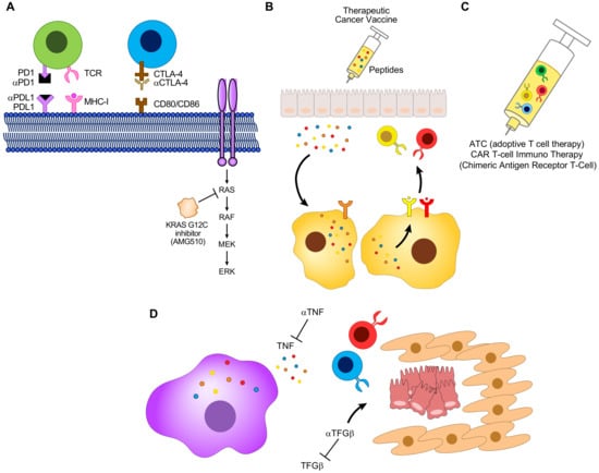 The future of CRC therapy: combinatorial agents. The current status of the use of inhibitor therapy (ICI) in the treatment of CRC has shown promising results, despite the lack of a complete response in dMMR-MSI-H tumors, and no response in pMMR-MSI-L. This obstacle has paved the way for insight and research into plausible combinatorial agents that can overcome this scientific impediment. (A) ICI in combination with AMG 510, a KRAS (G12C) inhibitor, or (B) therapeutic cancer vaccines, or (C) adoptive T cell therapy, or (D) TNF and TGFβ inhibitors may serve as the next candidates for combinatorial therapy with ICI.