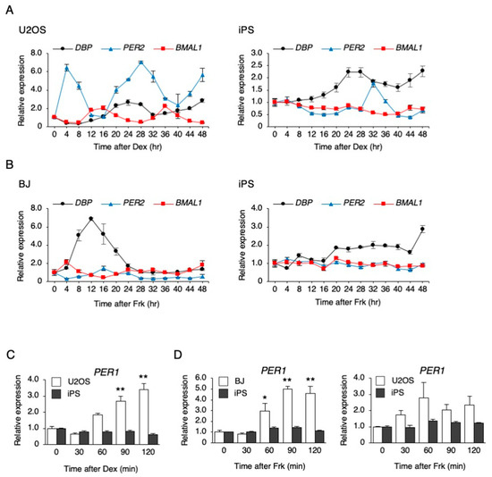 The response of clock genes to synchronizing stimulations in human-induced pluripotent stem cells (hiPSCs). (A) The expression levels of clock genes every 4 h after dexamethasone (Dex) stimulation in U2OS cells and hiPSCs. Data are presented as the means ± SEM relative to 0 h; n = 3 for each comparison. P values for the rhythmicity of DBP, PER2, and BMAL1 were determined by a cosinor analysis as p = 0.08, p = 0.02, and p < 0.01 in U2OS cells, and p = 0.54, p = 0.03, and p = 0.11 in hiPSCs. (B) The expression levels of clock genes every 4 h after forskolin (Frk) stimulation in BJ cells and hiPSCs. Data are presented as the means ± SEM relative to 0 h; n = 3 for each comparison. p values for the rhythmicity of DBP, PER2, and BMAL1 were determined by a cosinor analysis as p = 0.26, p = 0.29, and p = 0.02 in BJ cells, and p = 0.89, p = 0.21, and p = 0.59 in hiPSCs. (C) The expression level of PER1 after treatment with 0.1 µM Dex in U2OS cells and hiPSCs. Data are presented as the means ± SEM relative to each 0 h. n = 3 for each comparison. ** p < 0.01 versus the corresponding control. (D) The expression level of PER1 after treatment with 10 µM Frk in BJ, U2OS cells, and hiPSCs. Data are presented as the means ± SEM relative to each 0 h; n = 3 for each comparison. * p < 0.05, ** p < 0.01 versus the corresponding control.
