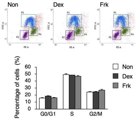 For the cell cycle analysis, cells in the DNA synthesis phase were labeled with EdU using Click-iT™ Plus EdU Flow Cytometry assay kits (Thermo Fisher Scientific, Waltham, MA, USA), and the DNA was stained using a FxCycle™ PI/RNase staining solution (Thermo Fisher Scientific, Waltham, MA, USA). Then, 47 h after Frk or Dex stimulation, the EdU was added and labeled for 1 h. Cells were harvested using TrypLE Select (Thermo Fisher Scientific, Waltham, MA, USA), fixed with 4% paraformaldehyde, and conjugated with an Alexa Fluor ™ 488 dye to detect EdU. Then, PI staining was performed and analyzed on a FACSVerse flow cytometer (BD Biosciences, San Jose, CA, USA). For the evaluation of the pluripotency of hiPSCs, cells were harvested using TrypLE Select and resuspended in PBS containing 1% bovine serum albumin (BSA); then they were incubated with an anti-human SSEA-4 (Thermo Fisher Scientific, Waltham, MA, USA) or anti-mouse IgG3 isotype control (Thermo Fisher Scientific, Waltham, MA, USA) for 45 min on ice. Next, the cells were washed and resuspended in PBS containing 1% BSA. SSEA-4 positive cells were analyzed on a FACSVerse flow cytometer. Data were analyzed using the FACSuite software (BD, Biosciences, San Jose, CA, USA).