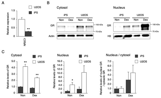 Response of downstream signaling to Dex stimulation in hiPSCs. (A) The expression level of NR3C1 in U2OS cells and hiPSCs. Data are presented as the means ± SEM relative to U2OS; n = 4 for each comparison. ** p < 0.01 versus the corresponding control. (B) GR levels in the cytosol or nucleus after Dex stimulation. (C) Quantified GR levels in the cytosol or nucleus before and after Dex stimulation. Data are presented as the means ± SEM relative to hiPSCs; n = 3 for each comparison. * p < 0.05, ** p < 0.01 versus the corresponding control.