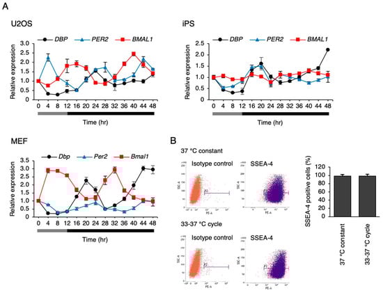 We attempted to clarify whether a circadian rhythm is elicited in hiPSCs when cultured under the simulated rhythms of body temperature, which is another synchronization factor for circadian rhythm. The human body temperature fluctuates between 36.5 °C and 37.5 °C, daily [28]. In the cultured cells, the circadian rhythm of clock gene expression was synchronized, even at a temperature fluctuation of 1 °C, while larger fluctuations like 4 °C synchronized it more efficiently [29]. We used the reliable protocol of 33 °C for 12 h and then 37 °C for 12 h to determine the presence or absence of the rhythms clearly. Consistent with the previous report, U2OS cells and mouse embryonic fibroblasts (MEFs) showed circadian rhythms in the genes expressed under this protocol (Figure 6A). Surprisingly, the circadian-like rhythm of DBP expression was observed in the hiPSCs. However, such rhythms were not observed in PER2 and BMAL1 expression (Figure 6A). To track this rhythm more clearly, DBP expression was measured at every 1 h interval in hiPSCs, and the data are shown in the Supplementary Figure S1. Significant rhythmicity (p < 0.01) was observed in the DBP expression with an acrophase of 20.5 h. Next, we checked whether the circadian-like rhythm of DBP expression depends on the exit from pluripotency in hiPSCs under this protocol. As a result, the percentage of SSEA-4-positive cells was similar between the cells cultured at 37 °C constantly, or those at 33–37 °C after culturing for 6 days (Figure 6B), showing that hiPSCs did not exit from pluripotent state by culturing them under this temperature rhythm.