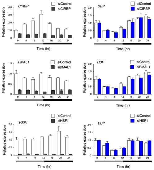 To investigate the mechanism through which the circadian-like rhythm of DBP expression was observed by the temperature rhythm, the genes CIRBP, BMAL1, and HSF1 [29,30], which are known to be involved in temperature rhythm-induced circadian rhythm, were inhibited by siRNA in hiPSCs. Then, the dynamics of the target genes and DBP expression were analyzed. The expression of CIRBP, which codes the cold-inducible RNA-binding protein, showed the significant rhythmicity via the temperature rhythm. Its expression gradually increased when the cells were cultured at 33 °C; then, it began to decrease after switching the temperature from 33 to 37 °C. The overall expression of CIRBP was clearly inhibited by siCIRBP. BMAL1 expression was unchanged by the temperature change, and HSF1 slightly increased after switching the temperature from 33 to 37 °C. The expression of these two genes was inhibited by each siRNA. Altogether, the inhibition of these genes did not result in any significant changes in the circadian-like rhythm of DBP (Figure 7).