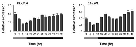 A microarray analysis was performed on the hiPSCs at 8 h and 20 h after changing to 33 °C under the temperature rhythm, which was chosen because DBP expression was lowest at 8 h, and highest at 20 h. The gene expression levels were compared between 8 and 20 h. Then, upregulated (more than 1.8-fold) and downregulated genes (less than 0.56-fold) at 20 h, in comparison to 8 h, were compared (Figure 8A,B and Supplementary Table S1). As a result, 17 genes were upregulated (more than 1.8-fold), while 45 genes were downregulated (less than 0.56-fold). Next, a gene ontology (GO) analysis was performed on these genes, and found that annotation of the GO biological process GO:0001666 (response to hypoxia) was significantly enriched in both the up- and downregulated genes (Supplementary Table S2). Among these genes, we focused on DDIT4 and TFRC because they have GO:0001666 (a response to hypoxia). Then, the dynamics of the levels of these genes were examined under the temperature rhythm. Similar to DBP, a circadian-like rhythm was observed in the expression of both DDIT4 and TFRC (Figure 8C). Next, we checked the levels of the representative genes VEGFA and EGLN1, which are well known to be downstream genes of HIF1A and to show a response to hypoxia [31]. A circadian rhythm was also observed for EGLN1 expression under the temperature rhythm (Figure 9).