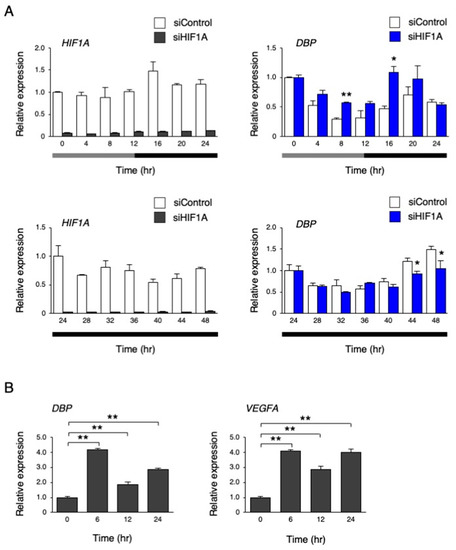 Next, we performed an inhibition of HIF-1α by HIF1A siRNA and measured the levels of DBP under the temperature rhythm. As a result, HIF1A mRNA levels were clearly repressed by siRNA, while the DBP rhythm was abolished in HIF1A siRNA-treated hiPSCs (p < 0.01 by two-way repeated measures ANOVA; Figure 10A). However, at a constant phase of 37 °C for 24 to 48 h, the repression of the DBP rhythm by HIF1A siRNA became weak but remained significant (p < 0.05 by two-way repeated measures ANOVA; Figure 10A). Then, we examined whether DBP expression is affected by hypoxia, and found that hypoxic treatment significantly increased its expression, similar to the known HIF-1α target gene, VEGFA (Figure 10B).