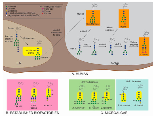 A schematic of N-glycosylation patterns found in (A) humans, (B) established biofactories including yeasts, plants, CHO cells, and (C) specific N-glycosylation patterns in microalgae. Glycans shown for (A) humans and (B) established biofactories are only illustrative and do not represent the totality of possible glycoforms obtained from these organisms. Differences in specificity of yeast, CHO, plant, and microalgal Golgi glycosyltransferases and glycosidases lead to variations in the final glycosylation profiles compared to humans. Consequently, glycans N-linked to recombinant proteins produced in these biofactories differ from native human proteins, necessitating glycan engineering to produce efficient and safe biopharmaceuticals in these alternative host systems. Green circle = Mannose. Blue circle = Glucose. Yellow circle = Galactose. Blue square = GlcNAc. White diamond = Neu5Gc. Me = Methylated residue. Fuchsia diamond = Sialic acid. Purple star = Xylose. Red triangle = Fucose. α-Man I = α-mannosidase I. GnT I = N-acetylglucosaminyltransferase I. α-Man II = α-mannosidase II. GnT II = N-acetylglucosaminyltransferase II.