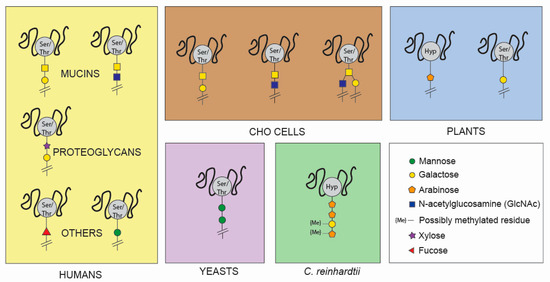 A comparison of the different O-glycosylation patterns among humans, CHO cells, yeasts, plants, and microalgae. Experimental evidence for O-glycosylation in microalgae is limited to C. reinhardtii [124]. Native C. reinhardtii proteins possess a (Hyp-O-Ara-Ara) core and methylated residues, characteristics that differ significantly from human O-glycosylation patterns. Ser/Thr = serine or threonine. Hyp = hydroxyproline. Green circle = Mannose. Yellow circle = Galactose. Orange pentagon = Arabinose. Blue square = GlcNAc. Me = Methylated residue. Purple star = Xylose. Red triangle = Fucose.