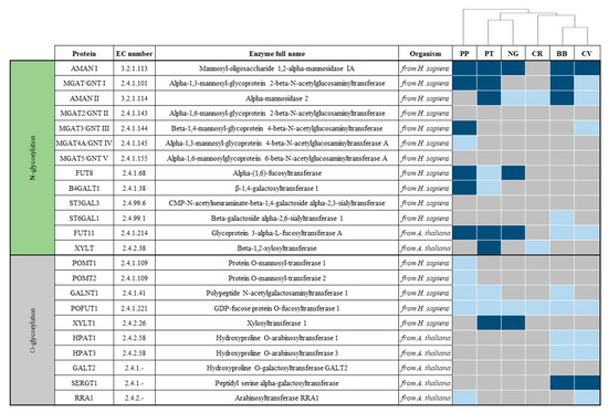 Hypothetical presence of protein N-glycosylation and O-glycosylation enzymes in the representative microalgal species, P. purpureum (PP), P. tricornutum (PT), Nannochloropsis gaditana (NG), C. reinhardtii (CR), B. braunii (BB), and C. vulgaris (CV), compared with glycosylation enzymes from H. sapiens and A. thaliana. Enzymes are classified as present (dark blue), potentially present (light blue) or missing (grey).