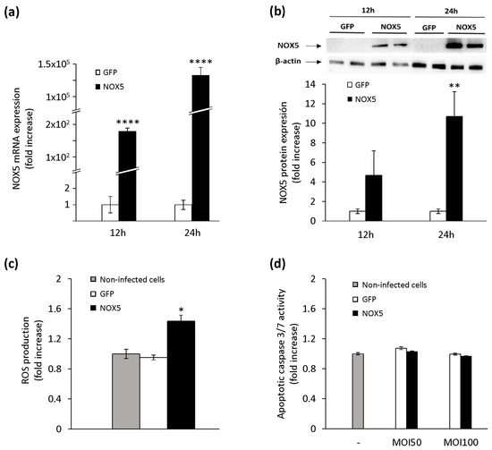 TeloHAEC infection with NOX5-β adenovirus resulted in higher mRNA expression of this oxidase (Figure 1a). After 12 h of infection, NOX5 was already overexpressed, and this effect was much more intense after 24 h. NOX5 overexpression had no effect on the mRNA levels of other NOX homologs (Figure S2).