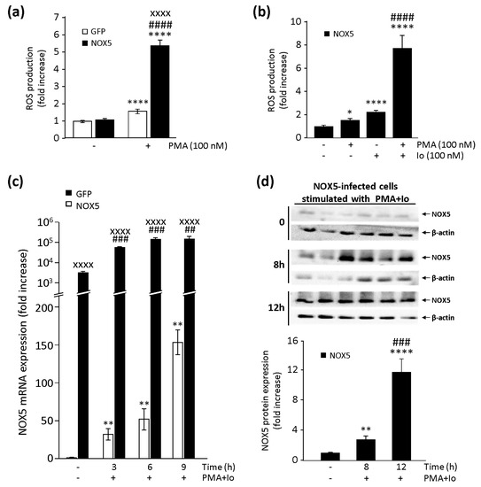 Characterization of NOX5 pharmacological stimuli in infected TeloHAEC. (a) ROS production measurements in NOX5-β- and GFP-infected cells for 24 h, and then stimulated with phorbol 12-myristate 13-acetate (PMA). n = 6. **** p < 0.0001 vs. non-stimulated GFP, #### p < 0.0001 vs. non-stimulated NOX5, and xxxx p < 0.0001 vs. GFP+PMA. (b) ROS production measurements in NOX5-β-infected cells for 24 h, and then stimulated with PMA, ionomycin (Io), or a combination of both. n = 6. * p < 0.05 vs. non-stimulated NOX5, **** p < 0.0001 vs. non-stimulated NOX5, and #### p < 0.0001 vs. NOX5+PMA or NOX5+Io. (c) NOX5 mRNA levels in NOX5-β- and GFP-infected cells for 24 h, and then stimulated with PMA+Io at different times. n = 6. ** p < 0.01 vs. non-stimulated GFP, ## p < 0.01 vs. non-stimulated NOX5, ### p < 0.001 vs. non-stimulated NOX5, and xxxx p < 0.0001 vs. the pertinent time of GFP-infected cells. (d) Representative NOX5 and β-actin immunoblots from cells infected for 24 h with NOX5-β adenovirus and stimulated with PMA+Io at different times, and quantification of NOX5 protein. n = 6. ** p < 0.01 vs. non-stimulated NOX5, **** p < 0.0001 vs. non-stimulated NOX5, and ### p < 0.001 vs. 8 h-stimulated NOX5.
