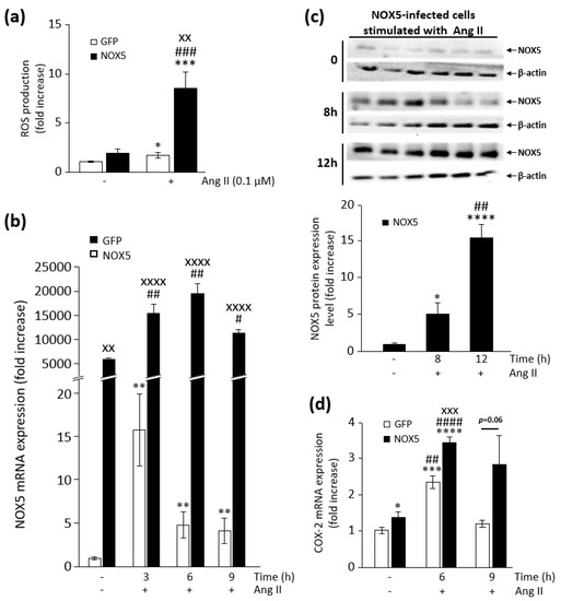 In the same way, Ang II is a hormone involved in the pathophysiology of hypertension and atherosclerosis, which also exerts its effects through PKC [31,32]. In fact, Ang II is an activator of NOX5 in human microvascular endothelial cells [24]. Similarly, as described above, we found that Ang II induced the upregulation of endogenous and recombinant NOX5 and increased ROS production, in both NOX5-β- and GFP-infected cells. Finally, the stimulus upregulated COX-2 expression in both infected cells, with this effect being longer in those infected with NOX5-β.