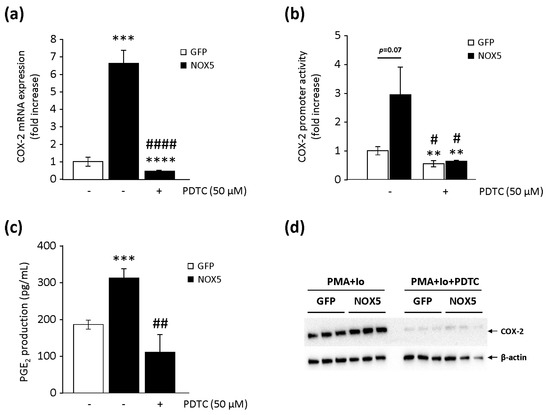 NF-κB is a relevant transcription factor that participates in ROS-mediated COX-2 upregulation [15,16,17]. Therefore, we studied whether it could play a crucial role in NOX5-mediated COX-2 upregulation. As shown in Figure 6a, the specific blockage of NF-κB by the PDTC inhibitor completely prevented the upregulated COX-2 mRNA levels found in NOX5-β-infected cells. Similar results were found when studying COX-2 promoter transcriptional activity (Figure 6b). Cells infected with NOX5-β enhanced its transcriptional activity, which is an effect that disappeared in the presence of PDTC. GFP-infected cells also suffered from a reduction in transcriptional activity in the presence of PDTC. Finally, the blockage of NF-κB with PDTC also prevented the increased PGE2 levels found in NOX5-β-infected cells (Figure 6c). In an additional experiment, we found that the exposure of NOX5-β- and GFP-infected cells to the pharmacological stimulus (PMA+Io) dramatically enhanced COX-2 protein expression (Figure 6d). This effect was even more intense in NOX5-β-infected cells than in GFP cells. Interestingly, this effect was softened in both groups when NF-κB was inhibited, supporting a key role for this transcription factor in COX-2 upregulation induced by NOX5-dependent ROS production.