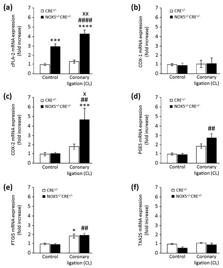 Quantification of enzymes involved in cardiac PG biosynthesis. (a) cPLA-2 mRNA expression in control and infarcted mice. *** p < 0.001 vs. CRE+/−, **** p < 0.0001 vs. CRE+/−, #### p < 0.0001 vs. CRE+/−CL, and xx p < 0.01 vs. NOX5+/−CRE+/−. (b) COX-1 mRNA expression in control and infarcted mice. (c) COX-2 mRNA expression in control and infarcted mice. *** p < 0.001 vs. CRE+/−, ## p < 0.01 vs. CRE+/−CL, and x p < 0.05 vs. NOX5+/−CRE+/−. (d) PGES mRNA expression in control and infarcted mice. ## p < 0.01 vs. NOX5+/−CRE+/−. (e) PGI2 synthase (PTGIS) mRNA expression in control and infarcted mice. * p < 0.05 vs. CRE+/−, and ## p < 0.01 vs. NOX5+/−CRE+/−. (f) Thromboxane A2 synthase (TXA2S) mRNA expression in control and infarcted mice. Control, control mice with no MI. Coronary ligation (CL), mice that suffered MI by LAD coronary ligation. CRE+/−, mice with the CRE+/− genotype (n = 9 for CRE+/− and NOX5+/−CRE+/− groups). NOX5+/−CRE+/− mice with the NOX5+/−CRE+/− genotype (n = 12 for the CRE+/−CL group, and n = 13 for the NOX5+/−CRE+/−CL group).