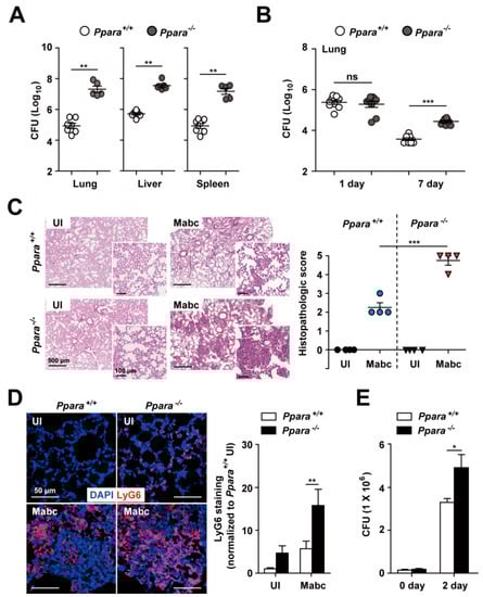 Ppara-/- mice are more susceptible than Ppara+/+ mice to Mabc infection. (A) Ppara+/+ (n = 7) and Ppara-/- (n = 5) mice were infected with Mabc (iv, 1 × 107 CFU), and the bacterial loads in the lung, liver, and spleen were determined at 7 dpi. (B) Ppara+/+ (n = 9) and Ppara-/- (n = 8) mice were infected with Mabc (in, 1 × 106 CFU), and the bacterial load in the lung was determined at 7 dpi. (C,D) Lungs from Mabc-infected mice at 7 dpi as in (A). (C) (Left) Representative H&E-stained images. Scale bars, 500 and 100 μm. (Right) Quantitative analysis of histopathology scores. (D) (Left) Lung tissues were stained with LyG6 (red) and DAPI (nuclei; blue). Scale bars, 50 μm. (Right) Average mean fluorescence intensities (MFIs) of LyG6. (E) Ppara+/+ and Ppara-/- BMDMs were infected with Mabc (MOI of 5) and intracellular survival of Mabc was determined at 2 dpi. Data are means ± SD of three independent experiments. Images are representative of three independent experiments (C and D). * p < 0.05, ** p < 0.01, and *** p < 0.001. ns, not significant; UI, uninfected.