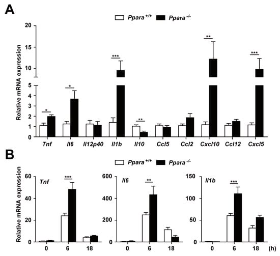 We next examined the mRNA and protein levels of these cytokines and chemokines in Ppara+/+ and Ppara-/- BMDMs after Mabc infection. As shown in Figure 2B, the mRNA levels of Tnf, Il6, and Il1b were significantly increased in BMDMs from Ppara-/- mice, compared with Ppara+/+ mice, at 6 h after Mabc infection. In addition, the TNF and IL-6 protein levels were markedly upregulated in Ppara-/- BMDMs compared with Ppara+/+ BMDMs, at 6 and 18 h after Mabc infection (Figure 2C). Furthermore, the expression of TNF, IL-6, and IL-1β mRNA and protein levels were significantly increased in Ppara-/- BMDMs, compared with Ppara+/+ BMDMs, after Mabc infection (Figure 2D,E; protein and mRNA, respectively). Together, these data suggest that proinflammatory responses are markedly upregulated in the lungs and macrophages from Ppara-/- mice, compared with Ppara+/+ mice, during Mabc infection.