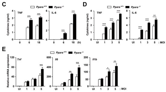 PPARα protects against excessive inflammation in Mabc-infected mice and macrophages. (A) Proinflammatory cytokine and chemokine mRNA levels in lung tissue were determined by qRT-PCR, as in Figure 1A. (B,C) Ppara+/+ and Ppara-/- BMDMs were infected with Mabc (MOI of 5) for the indicated times, and the levels of proinflammatory cytokines were measured by qRT-PCR (B) or ELISA (C). (D,E) Ppara+/+ and Ppara-/- BMDMs were infected with Mabc (MOI of 1, 3, or 5), and the levels of proinflammatory cytokines were determined by qRT-PCR at 6 h (E) or ELISA at 18 h (D). Data are means ± SD of three independent experiments. * p < 0.05, ** p < 0.01, and *** p < 0.001. UI, uninfected.