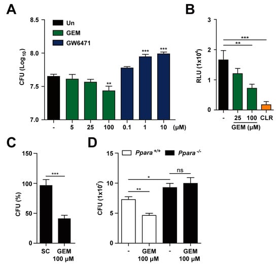 GEM promotes the antimicrobial response during Mabc infection in a PPARα-dependent manner. (A) BMDMs were infected with Mabc (MOI of 5) and treated with gemfibrozil (GEM; 5, 25, or 100 μM) or GW6471 (0.1, 1, or 10 μM) for 3 dpi. Intracellular survival of Mabc was determined by CFU assay. (B) BMDMs were infected with Mabc-LuxG13 (MOI of 5) and treated with GEM (25 or 100 μM) or clarithromycin (CLR; 5 μg/mL) for 3 dpi. Intracellular survival of Mabc was determined by bioluminescence analysis. (C) Human MDMs were infected with Mabc (MOI of 5) and stimulated with GEM (100 μM) for 3 dpi. Intracellular survival of Mabc was determined. (D) Ppara+/+ and Ppara-/- BMDMs were infected with Mabc (MOI of 5) and treated with GEM (100 μM) for 3 dpi. Intracellular survival of Mabc was measured by CFU assay. Data are means ± SD of three independent experiments. * p < 0.05, ** p < 0.01, and *** p < 0.001. Un, untreated; SC, solvent control; ns, not significant.