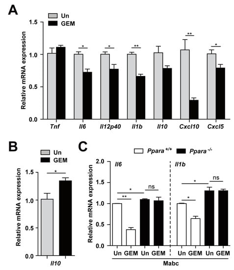 PPARα activation by GEM regulates the Mabc-mediated expression of inflammatory cytokines in a PPARα-dependent manner. (A,B) BMDMs were infected with Mabc (MOI of 5) and treated with gemfibrozil (GEM; 100 μM) for 6 (B) or 18 h (A). The mRNA levels of proinflammatory cytokines and chemokines were determined by qRT-PCR. (C) Ppara+/+ and Ppara-/- BMDMs were infected with Mabc (MOI of 5) and treated with GEM (100 μM) for 18 h. The mRNA levels of Il6 and Il1b were measured by qRT-PCR. Data are means ±SD of three independent experiments. * p < 0.05 and ** p < 0.01. Un, untreated; ns, not significant.