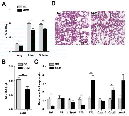 To confirm and extend the in vitro data, we next assessed the function of PPARα activation by GEM in the defense against Mabc infection in vivo. C57BL/6 mice were infected with Mabc iv, and GEM (15 g/kg body weight) was administered orally. As shown in Figure 5A,B, the numbers of viable bacteria in the lung, liver, and spleen were significantly reduced in GEM-treated mice compared with control mice (Figure 5A,B, iv and in, respectively). Consistent with the in vitro results (Figure 4A), the mRNA levels of proinflammatory cytokines (Tnf and Il1b) were significantly decreased in the lung of GEM-treated mice compared with control mice (Figure 5C). In addition, the Il10 mRNA level was significantly upregulated in the lung tissue of GEM-treated mice compared with control mice (Figure 5C).
