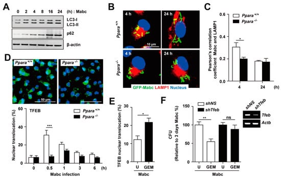 TFEB is an essential transcription factor for genes involved in autophagy and lysosomal biogenesis [34]. TFEB activation is required for IFNγ- or PPARα-induced autophagy and restriction of the intracellular growth of M. tuberculosis [20,35]. However, the nuclear translocation of TFEB has not been investigated in the context of Mabc infection. We compared the intracellular translocation of TFEB in BMDMs after Mabc infection between Ppara+/+ and Ppara-/- BMDMs. As shown in Figure 6D, we found that TFEB nuclear translocation was significantly increased in Ppara+/+ BMDMs, but markedly decreased in Ppara-/- BMDMs, after 30 min of Mabc infection.