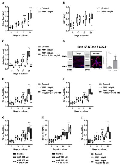 Incubation of HSCF cultures with AMP (30–100 µM) for 28 days concentration-dependently increased (p < 0.05) collagen production (Sirius Red assay; Figure 2A) without affecting cells growth (MTT assay; Figure 2B). The pro-fibrotic effect of AMP (100 µM) was fully prevented by the non-nucleotide inhibitor of ecto-5′-nucleotidase/CD73, concanavalin A (0.01 mg/mL) (Figure 2C). Interestingly, the facilitatory effect of AMP on collagen production was more evident at culture days 21 and 28. These time points coincided with increases in the ecto-5′-nucleotidase/CD73 protein content shown by immunocytochemistry and Western blot analysis comparing culture days seven and 28 (Figure 2D).