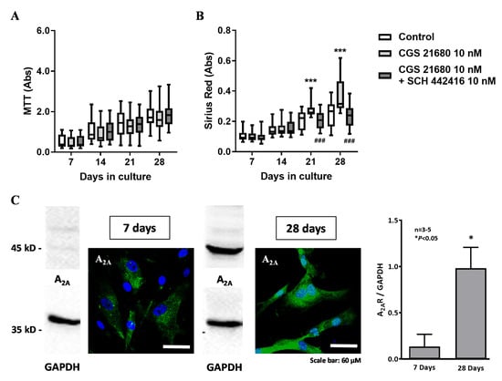 The facilitatory effect of AMP (100 µM) on collagen production was mimicked by the selective A2A receptor agonist CGS21680C (10 nM) (Figure 3B). Likewise, the A2A receptor agonist also did not modify cell viability/proliferation of HSCF (Figure 3A). The facilitatory effect of CGS 21680 (10 nM) on collagen production by HSCF was prevented by co-application of the selective A2A receptor antagonist, SCH442416 (10 nM) (Figure 3B); neither CGS 21680 (10 nM) alone or in the presence of SCH442416 (10 nM) affected viability/proliferation of HSCF (Figure 3A). Like that observed with AMP (100 µM), the pro-fibrotic effect of CGS 21680 (10 nM) was more evident at culture days 21 and 28, when HSCF exhibited the highest A2A receptor immunoreactivity, as determined by immunocytochemistry and Western blot analysis (Figure 3C).