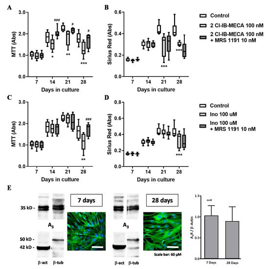 The adenosine metabolite, inosine (100 µM), mimicked the inhibitory effect of the adenosine A3 receptor agonist, 2Cl-IB-MECA (100 nM), on cells proliferation/viability (MTT assay, A and C) and collagen production (Sirius Red staining, B and D) by human subcutaneous fibroblasts (HSCF) grown in culture for 28 days. Inhibition of HSCF cells proliferation by 2Cl-IB-MECA (100 nM, A) and inosine (100 µM, C) was attenuated by MRS1191 (10 nM), but the selective A3 receptor antagonist did not affect the inhibitory role of 2Cl-IB-MECA (100 nM, B) and inosine (100 µM, D) on collagen production. Boxes and whiskers represent pooled data from at least three different individuals; 4–6 replicas were performed for each individual. * p < 0.05, ** p < 0.01 and *** p < 0.001 (two-way ANOVA) represent significant differences compared to control conditions; # p < 0.05 and ### p < 0.001 (two-way ANOVA) represent significant differences compared to the effect of 2Cl-IB-MECA in the same set of experiments. Panel E shows that A3 receptor expression (green) was kept fairly constant with time of the cells in culture, as evidenced both by immunofluorescence confocal microscopy and by Western blot analysis normalized either by β-actin (left hand-side blots) or β-tubulin (right hand-side blots) content of the cells. Nuclei are stained in blue with DAPI. Shown are representative data of cells from four different individuals cultured for 7 and 28 days, respectively; experiments were performed in triplicate.