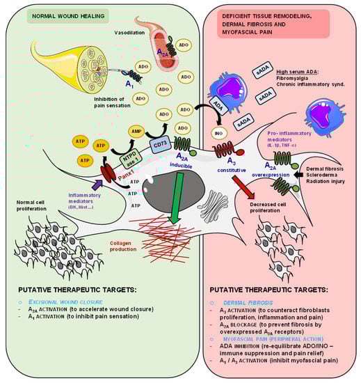Overall, data enlighten the idea that adenosine, via preferential activation of A2A receptors in fibroblasts, might be a key player in human subcutaneous connective tissue homeostasis and normal wound repair, while excessive scarring and dermal fibrosis may occur when this receptor is overexpressed (Figure 6). For instance, adenosine A2A receptor antagonists have been proposed to prevent radiation-induced dermal injury []. Disturbed adenosine homeostasis in the subcutaneous tissue may happen upon infiltration by ADA-bearing inflammatory cells and/or in situations occurring with increases in serum ADA levels, such as fibromyalgia and other chronic inflammatory conditions []. Under such circumstances, the unpredicted breakdown of adenosine into inosine, and subsequent activation of A3 receptor in HSCF may favor deficient connective tissue remodeling and failure of its viscoelastic properties. Given the fact that subcutaneous connective tissue forms an interconnected net throughout all body [,], increases in tissue tension can waveform propagate the release of adenine nucleotides and inosine formation whenever ADA is available, resulting in global changes in the connective tissue network further restraining its compliance. This feature may be the basis for enhanced peripheral inputs and superfluous nociceptive transmission from peripheral soft tissues, which might be involved in the pathogenesis of chronic myofascial pain (Figure 6).