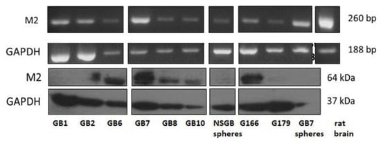 The presence of M2 muscarinic receptors was investigated in several GSC lines derived from different patients’ biopsies. Semi-quantitative RT-PCR analysis showed that all GSCs express the M2 transcript, albeit different levels of expression were evident (Figure 1 upper panels). Western blotting analysis was also performed in the same GSC lines, indicating that only some of these express M2 receptor at the protein level (i.e., GB6, GB7, GB8, GB10, and GB166) (Figure 1 lower panels). For subsequent studies, we selected GB7 and GB8 cells, considering their different levels of M2 receptor expression. In fact, the levels of M2 receptor expression appeared significantly higher in GB7 than in GB8 cells (GB7>GB8) [18]. In particular, the expression of M2 receptor protein in GB7 cells was also evaluated in GB7 grown in adherent or neurosphere conditions, confirming that the expression of M2 receptor was present in both culture conditions (see Supplementary Figure S1).