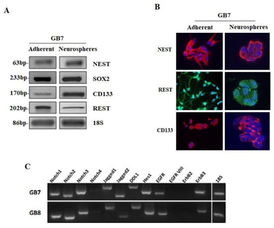 GB7 cells grown in adherent and as neurospheres. (A) RT-PCR analysis of stemness markers Nestin (NEST), SOX2, CD133, and REST. 18 S was used as a housekeeping gene. (B) Immunostaining for NESTIN, REST and CD133 in GB7 cells grown as a monolayer and as neuropheres in floating conditions (magnification × 100). (C) RT-PCR analysis for gene expression for different genes involved in Notch and EGFR pathways in GB7 and GB8 cells. 18 S was used as a housekeeping gene.