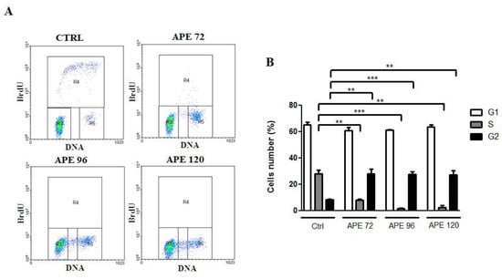 (A) Bivariate analysis of BrdUrd incorporation and DNA content in GB7 cells at 72, 96 and 120 h after 100 μM APE treatment. (B) Percentage of GB7 cells in G1, S, and G2/M phases after 100 μM APE treatment. (t-test; **p < 0.01; ***p < 0.001). The data are the average ±SEM of three independent experiments.
