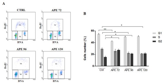 To evaluate whether the APE-induced decrease in cell number was dependent on the impaired cell proliferation or survival, we performed a cell cycle analysis on GB7 and GB8 cells treated with 100 μM APE for 72, 96 and 120 h. Before collecting the cells, BrdU incorporation was performed for 90 min to monitor the S phase progression. The flow cytometry analysis has been performed selecting specific gates that have allowed to analyze the distribution of the cells in different cell cycle phases (G1-S-G2/M). The bi-parametric analysis of BrdU labeling versus DNA content allowed to evaluate both cell progression through the G1/S/G2-M phases and the identification of cells in S phase. This analysis showed that GB7 cells exhibited a significant decrease in the BrdU labelled cell fraction after APE treatment accompanied by a decrease in the percentage of cells in S phase and accumulation of cells in the G2/M phase (Figure 3A,B).