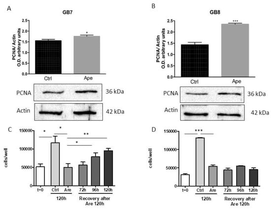 Western blot analysis for PCNA expression in GB7 (A) and GB8 (B) cells in absence (ctrl) and presence of 100 µM APE (48 h). The diagrams above report the densitometric analysis of the PCNA immunoreactive bands normalized to those of the β-actin reference. The data are the average ±SEM of three independent experiments (t-test; *p < 0.05; *** p< 0.01). (C) and (D) Recovery of cell proliferation after APE withdrawal. The cells were maintained for 120 h in the presence of APE 100 µM. Then the APE was removed from the culture media and substituted by fresh medium without APE for an additional 72, 96 and 120 h. Results are reported for GB7 (C) and GB8 (D) cells. (t-test; *p < 0.05; ** p < 0.01; ***p < 0.001).